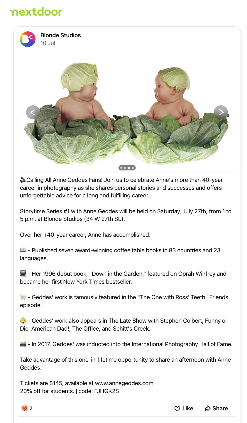 I was tasked to make emails and advertisements for an event Anne was putting together over the summer. “Storytime Series #1,” an event were Geddes shared stories about her life and successful career.